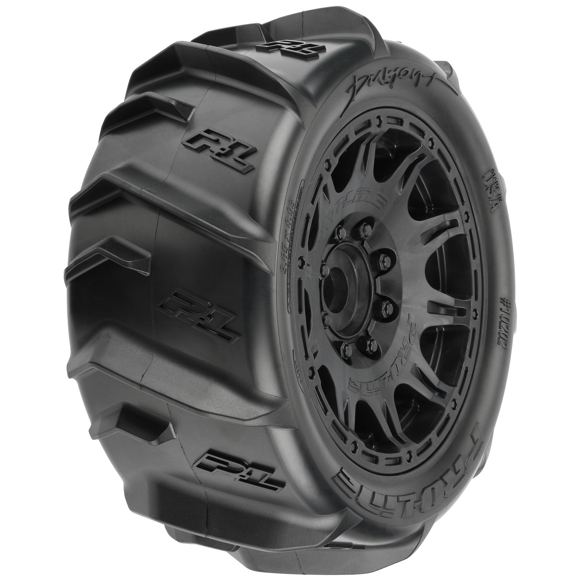 This is a pair of Dumont Paddle Sand/Snow Tires Mounted on Raid 5.7" Black Wheels . Are you ready for the most extreme Paddle tires Pro-Line has ever made for Monster Truck? Introducing the Dumont 5.7" tires that have been designed from the ground up for your X-MAXX® and KRATON™ 8S to sling sand and snow further than ever before and look good doing it!