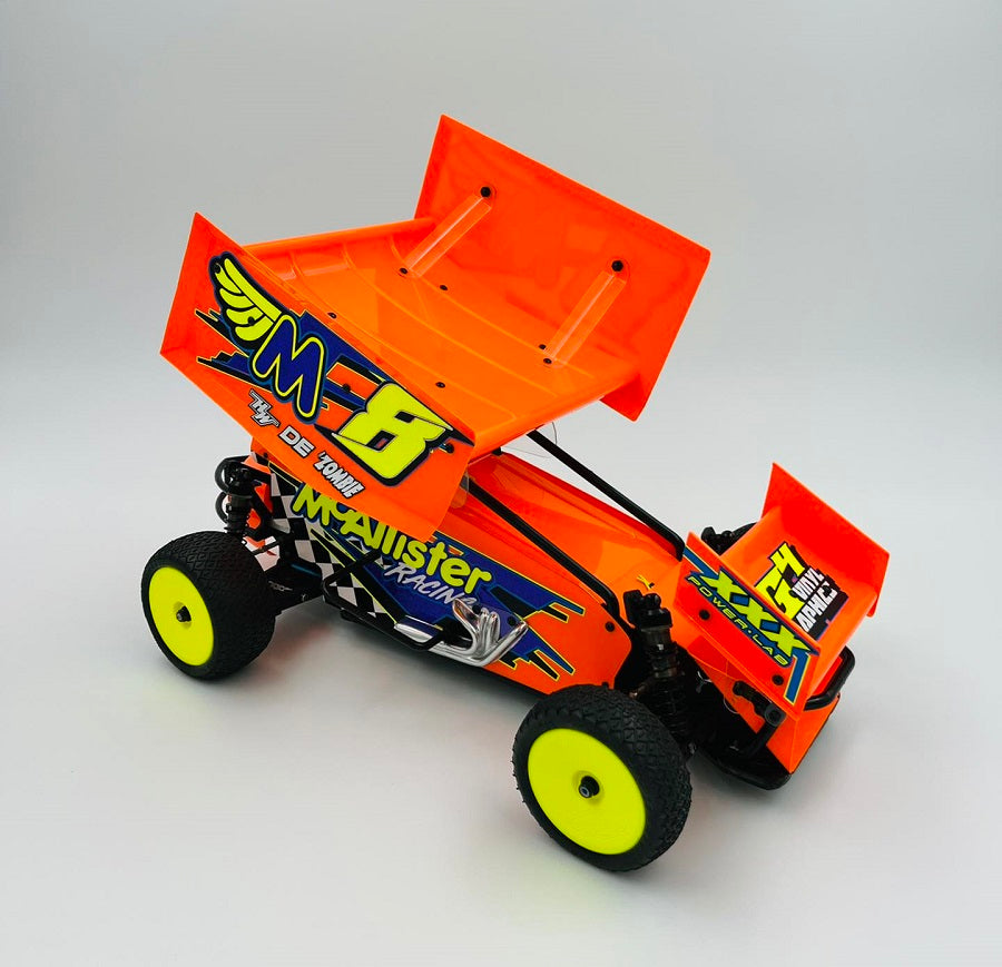 -Includes: Pre-cut and drilled nose (#440), Streamline hood (#438-S), Pre-Cut and drilled side panels (#432-M), Tail tank (#759), Exhaust headers (#402), **4.5"x3" Large front wing kit (#753), and *7x7 Top wing kit (#755).