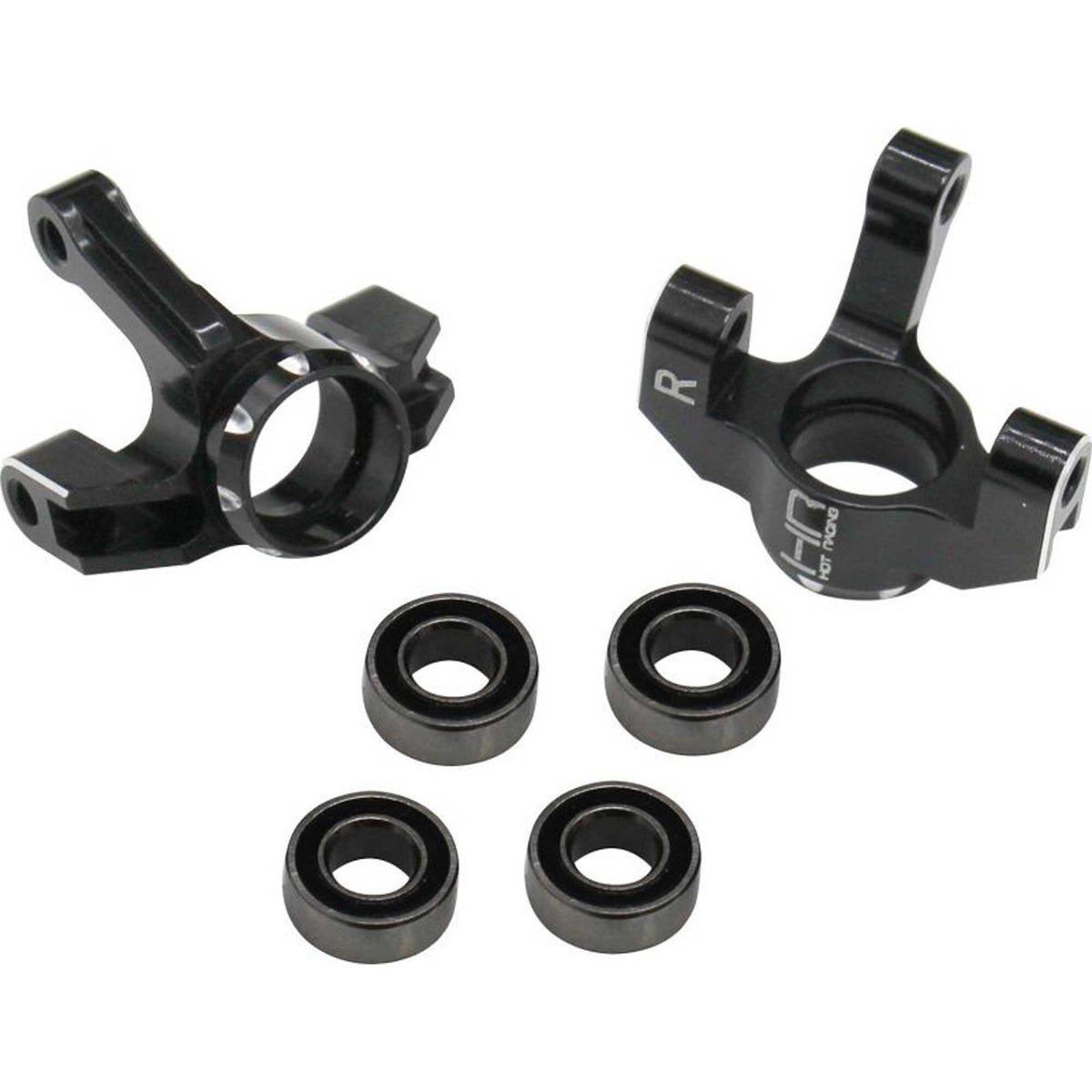 Hot Racing Aluminum Front Knuckle and Spindle Steering Arm Set is a direct upgrade for the plastic steering arms. It features an oversized 4x8x3 rubber sealed bearing for improved durability, and a sleek anodized black coating. This is a great upgrade for drivers looking for improved precision in steering due to the original plastic arms wearing out over time.