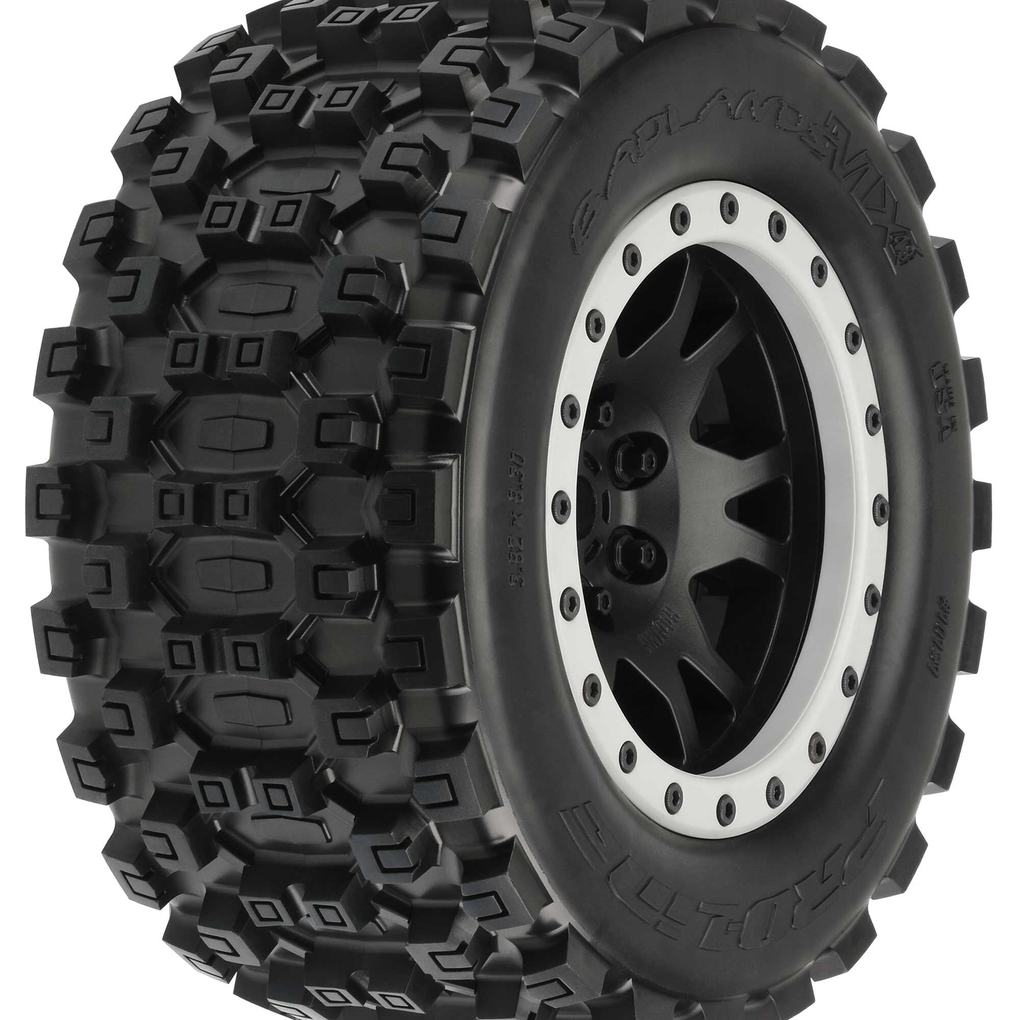 This is a pair of pre-mounted Badlands MX43 tires for X-MAXX®. Pro-Line is ready to unleash the long-awaited tire solution for X-MAXX® owners with the Biggest and Baddest tire and wheel combo ever conceived: the Badlands MX43 mounted on Impulse Wheels! Pro-Line Badlands tires are known for having a sweet Motocross inspired tread and the all-new Badlands MX43 tires kick that up a notch with a Bigger and Bolder knobby tread that matches modern MX tire design. These tires have been developed from the ground up for extreme X-MAXX® punishment with an all-new ultra-durable compound that prevents tire ballooning even at high speeds. The Badlands MX43 features Pro-Line's ground breaking proprietary Pro-Loc Technology that creates an ultra-secure bond to Pro-Line's Impulse Pro-Loc X-MAXX® wheels while still being removable when required. The Badlands MX43 is a true All-Terrain tire that will find traction on any surface but is best suited for loose & loamy dirt, mud or grass. Just imagine your X-MAXX® throwing up huge rooster tails with these aggressive looking tires!