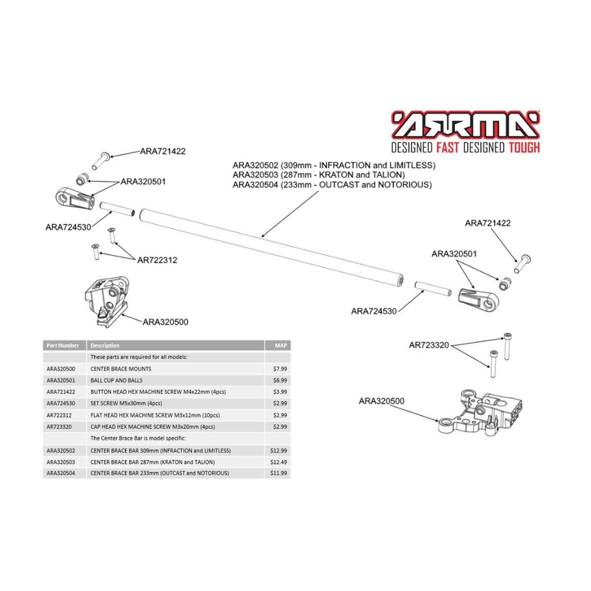 ARRMA Center Brace Mounts ARA320500 is compatible with ARA106040T1, ARA106040T2, ARA106042T1, ARA106042T2, ARA106044T1, ARA106044T2, ARA106048, ARA109001, ARA109011