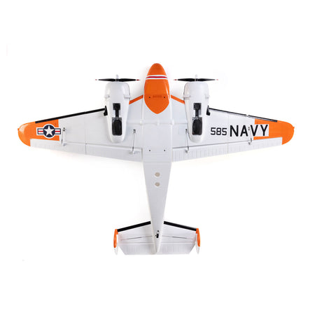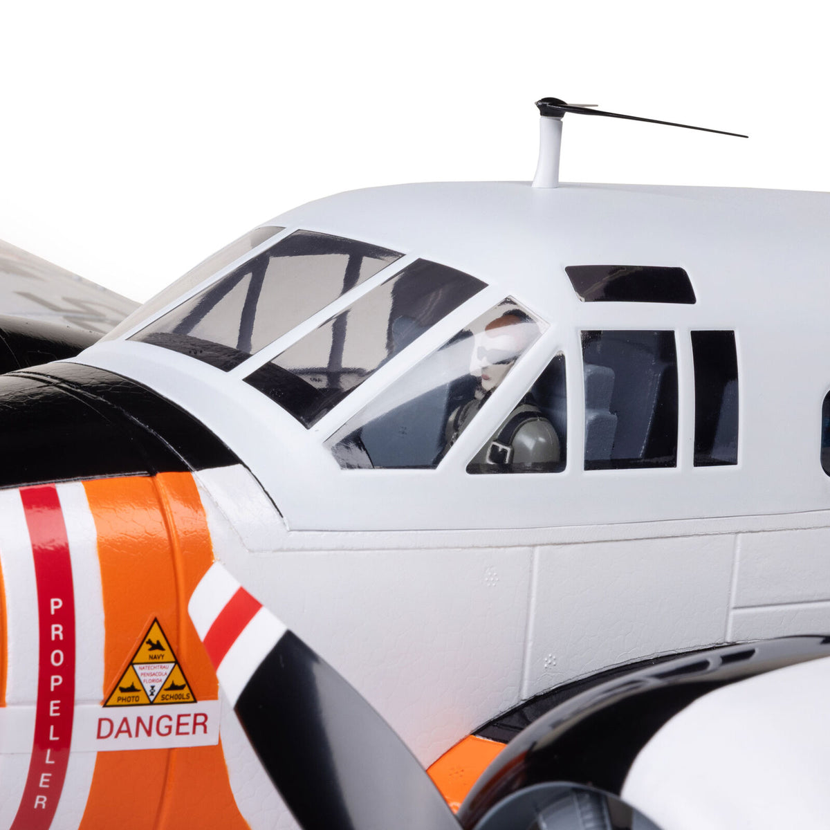 The factory-assembled airframe is equipped with an abundance of scale detail, including molded-in panel lines and hatches, antennas, exhaust stacks, a pilot figure, and more. Additionally, it's factory-finished in a fully painted white with orange and black Navy RC-45J (SNB-5P) navigation and photo reconnaissance trainer trim scheme.