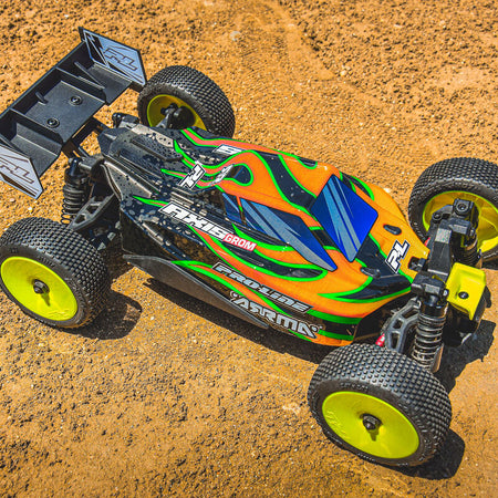 Now you can have a Pro-Line Axis body for your Typhon™ GROM to match your 1/10 version in a cool paint scheme! Designed with the latest in CAD technology, the Axis features a super low-slung design with sharp lines throughout giving it an unmistakable look on the track, and fits the Typhon™ GROM chassis perfectly. The Axis features a cab-forward design that provides enhanced steering response while the small side fins balance out the rear of the car with ideal side-bite. XT