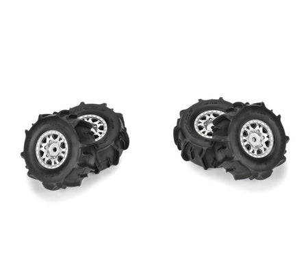 PRO1030910 | Dumont 1.2"1.7" Paddle Sand Tires Mounted on Impulse Satin Silver 12mm Hex Wheels (4) for ARRMA® Mojave™ GROM Front and Rear