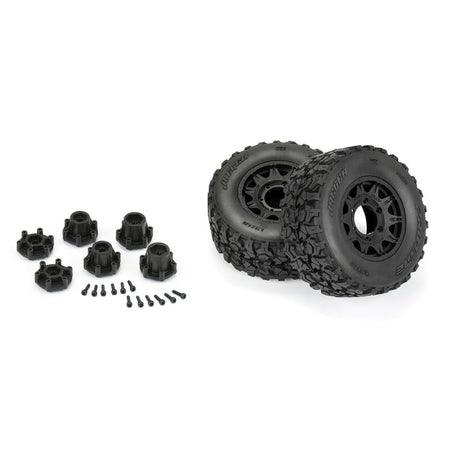 This is a pair of pre-mounted Jaeger HP 2.8" BELTED All-Terrain Tires Mounted on Raid Black Removable Hex Wheels. Pro-Line has a 2.8" tire with a low profile that can handle high speeds. Meet the Jaeger HP BELTED 1/10 Monster Truck tire! With its aggressive lateral tread design, this tire has the forward bite you desire, while having a self-cleaning ability. The center of the tread features grooves that allow for flexibility over rough terrain while maintaining stability.
