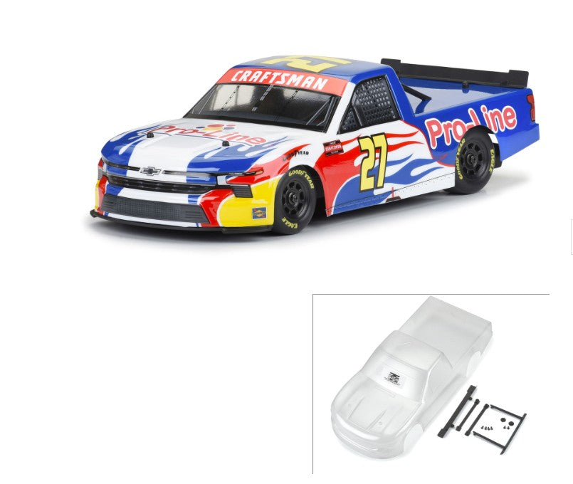 Let's go truck racing! Introducing the 2024 Chevrolet® Silverado NASCAR® Truck Series Clear Body for Losi® NASCAR® Racecar! Pro-Line has captured all the details of this 2024 manufacturers' championship winning Chevrolet® body for truck fans everywhere. Officially licensed by both NASCAR® and Chevy®, this body comes clear so that you can paint it up in your favorite NASCAR® driver's scheme or create your own. It includes detailed graphics such as windshield frames, sponsor logos, and side skirts.