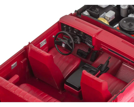 The Revell 1/25 1985 GMC Jimmy 4x4 High Roller Plastic Model Kit delivers a highly detailed and rugged off-road experience in miniature form. Featuring a multi-piece four-wheel-drive chassis with lifted suspension, a detailed 350-cubic-inch V-8 engine, and newly tooled oversized off-road tires on classic spoked “wagon” wheels, this kit captures the adventurous spirit of the squarebody Jimmy. Optional parts include dual front shocks, roof-mounted light bar, and front bumper guards, while removable roof and engine-access panels provide added realism. Molded in white and clear with soft black tires, it includes factory-correct decals, precise detailing, and authentic proportions for a truly collectible model.