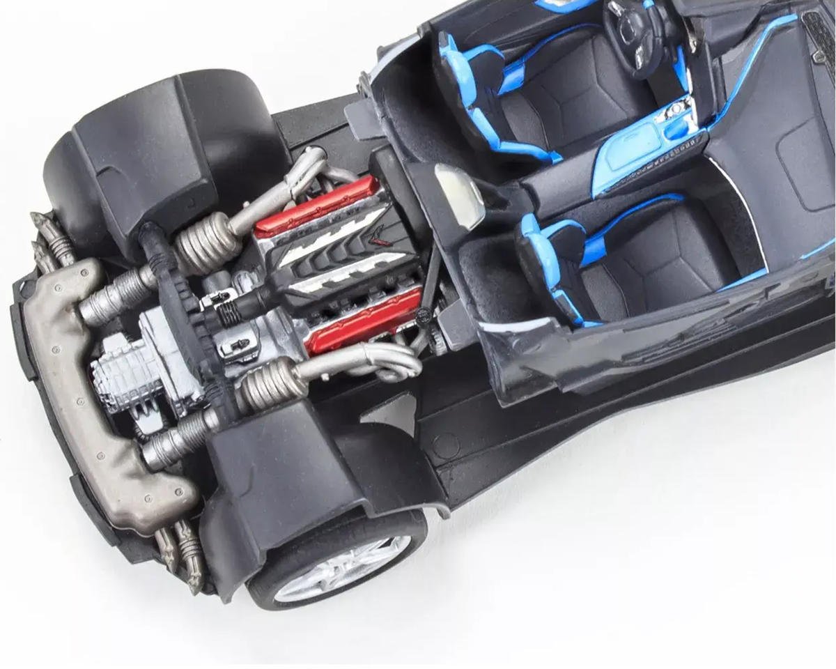 In addition to its intricate engine and transmission, the kit includes a multi-piece interior with GT2 sport seats. Builders can choose between left- or right-hand-drive configurations for the dashboard and center console, enhancing the customization options. Authentic wheels in Corvette’s signature five-open-spoke design complete the look. The model also features a detailed chassis with steerable front wheels, a removable roof panel, and an opening engine cover, allowing for a dynamic display once assembled.