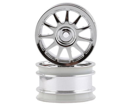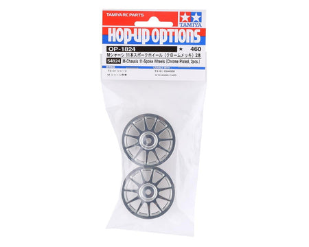 Tamiya M-Chassis 11-Spoke Wheels. These wheels feature an 11 spoke design and are chrome plated for a clean, reflective, finish. Package includes two optional wheels intended for the Tamiya T3-01 and M-Chassis.