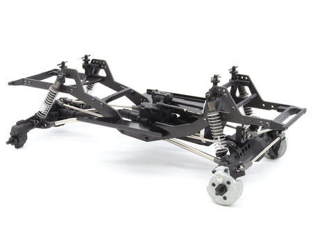 The VRD Carbon Kit's chassis is a testament to versatility and adaptability. With carbon fiber rails, it features molded components that provide tunable options, making it suitable for both beginners and seasoned rock crawling enthusiasts. Multiple shock and body mounting positions, along with stamped aluminum rock sliders, ensure straightforward body mounting and fitment while protecting your electronics. These come together and allow for a higher level of versatility over different crawling environments.